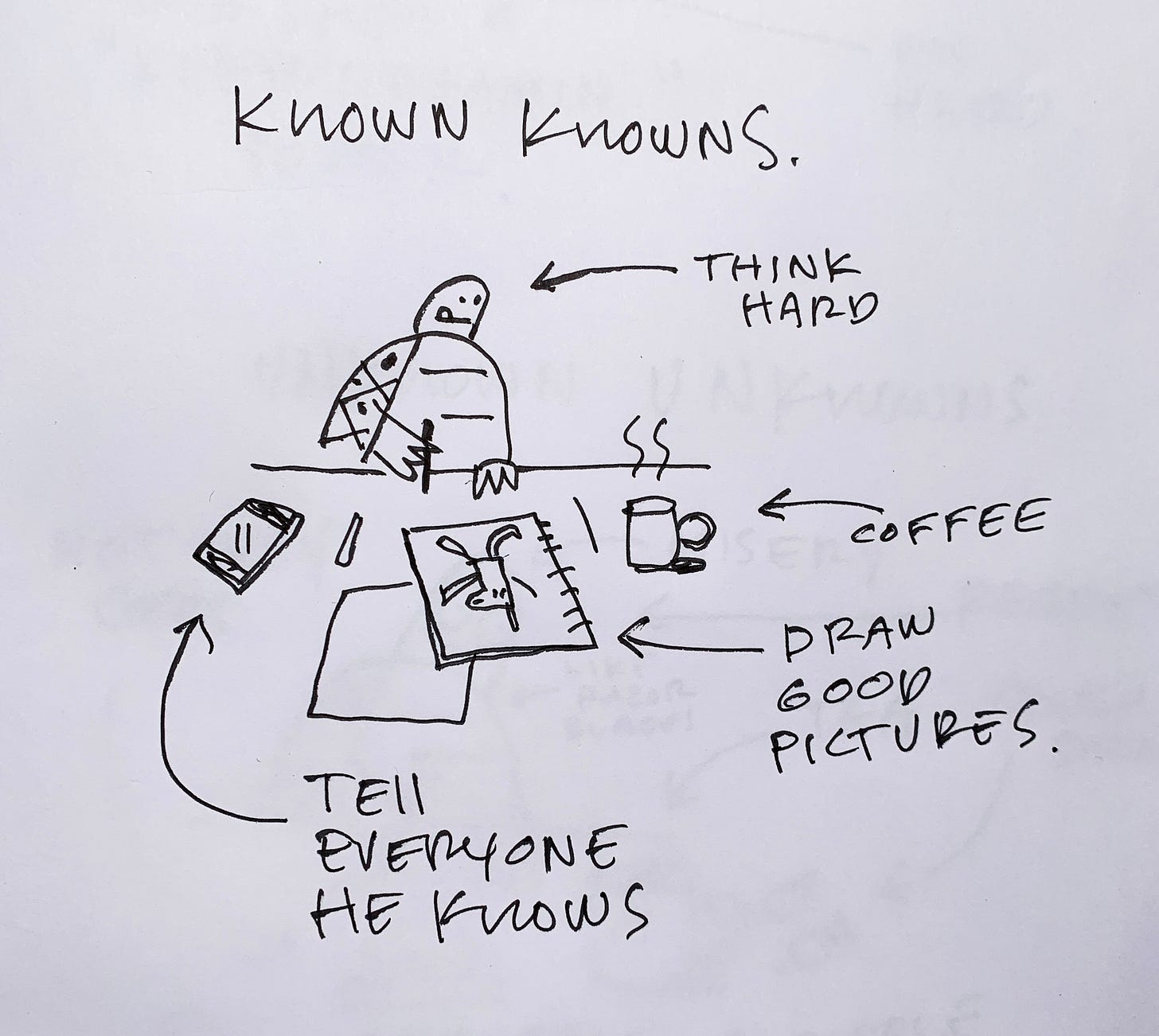The known knowns are the tasks, trials and tribulations he is aware of on his journey to his yacht. Can he write a good story? Can he draw good pictures? Can he shoehorn talking about his dream into unrelated casual conversation?